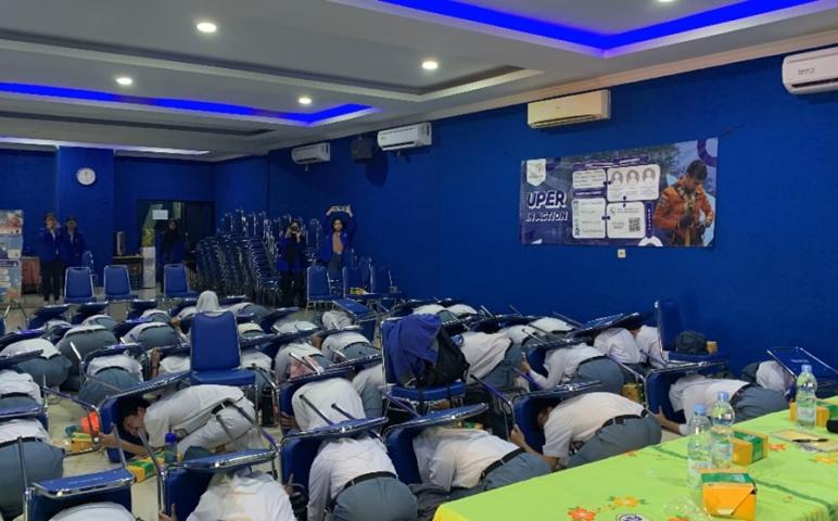 Dalam sesi simulasi gempa bumi, UPER dan tim BNPB melakukan penyelamatan diri sederhana dengan berlindung di bawah meja yang kuat. Langkah ini melindungi dari benda-benda yang mungkin jatuh atau terlempar selama bencana.