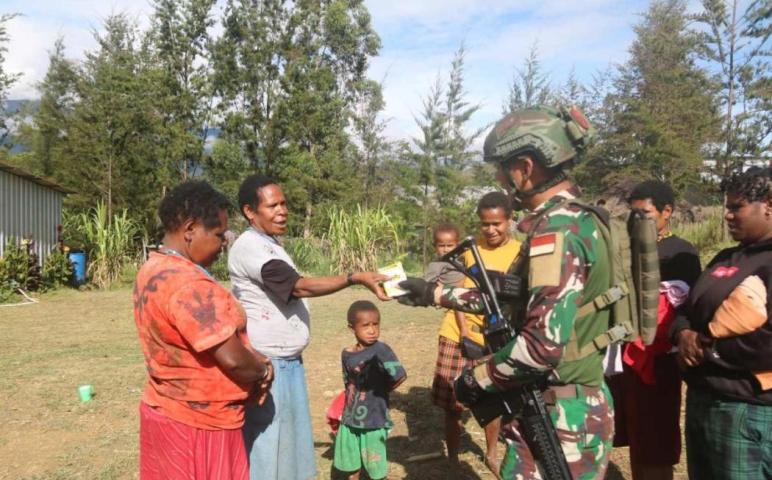 Puncak - Prajurit TNI Satgas Mobile Yonif 323/BP membagikan bantuan sembako kepada warga di Kampung Kago, Distrik Ilaga, Kabupaten Puncak, Papua, Sabtu (22/06/2024).