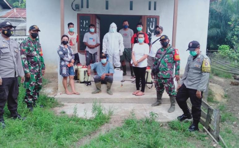 Landak –Anggota Koramil 12/Air Besar, Serda Lipsin bersama petugas dari Puskesmas Serimbu dan relawan Covid-19 melaksanakan penyemprotan disinfektan di lingkungan rumah salah seorang warga yang sedang menjalani isolasi mandiri di Desa Sepangah, Kecamatan Air Besar, Kabupaten Landak, Selasa (1/6/2021).