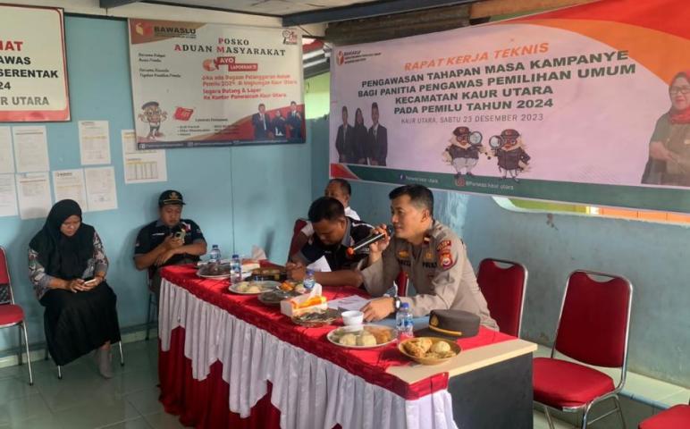 Kaur - Polsek Kaur Utara Polres Kaur Polda Bengkulu Kapolsek Kaur Utara menghadiri undangan sebagai narasumber dalam Rakernis pengawasan tahapan kampanye Panwaslu Kec. Kaur Utara di sekretariat Panwascam Kaur Utara, Sabtu (23/12/2023), Pukul 08.30 WIB.
