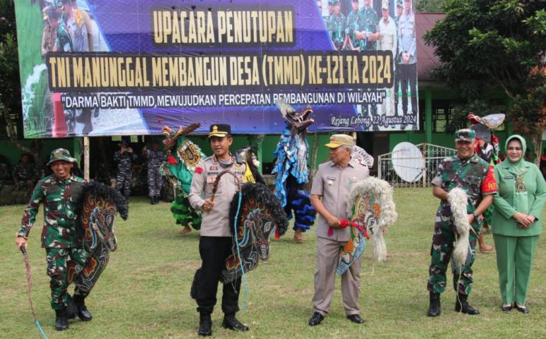 Rejang Lebong - Kapolres Rejang Lebong, AKBP Eko Budiman, S.I.K., M.I.K., M.Si., menghadiri upacara penutupan TNI Manunggal Membangun Desa (TMMD) Ke-121 Tahun Anggaran 2024 yang berlangsung di Desa Belumai I dan Desa Belumai II Kec. PU. Tanding Kabupaten Rejang Lebong, pada Kamis (22/8/2024).
