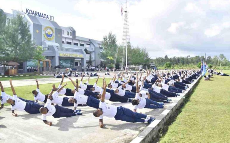 Sorong - Untuk menjaga Fisik dan Stamina, Prajurit Koarmada III rutin melaksanakan olahraga pagi setiap hari Jumat dan Selasa di Lapangan Koarmada III, Katapop, Kab. Sorong..Jum’at (13/9/24).