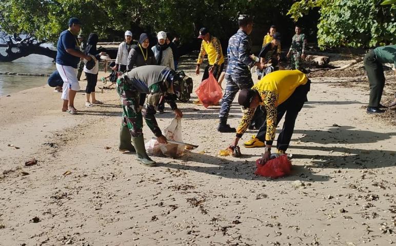 Bengkulu Utara - Aksi peduli lingkungan ditunjukkan anggota TNI-Polri dan masyarakat di kecamatan Enggano. Mereka ramai-ramai membersihkan pantai yang ada di Desa Apoho, Kamis (13/7/2023).