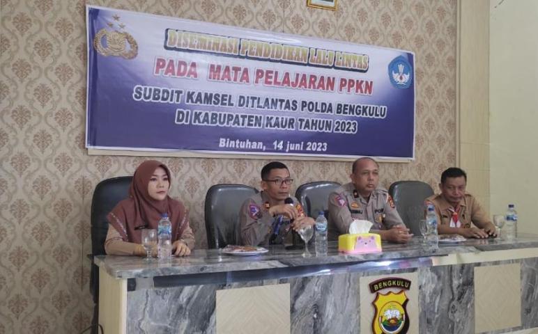 Kaur - Unit Kamsel Sat Lantas Polres Kaur Polda Bengkulu, Pada hari Rabu, (14/06/2023) Pukul 09.00 Wib s/d Selesai, melaksanakan kegiatan pelaksanaan Desiminasi Pendidikan Lalu Lintas Bersama Dinas Pendidikan Terkait di Aula Sat Intelkam Polres Kaur.