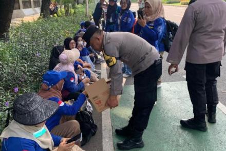 Polisi Bagikan 500 Duz Air Mineral Dan Permen Untuk Massa Buruh Di DPR