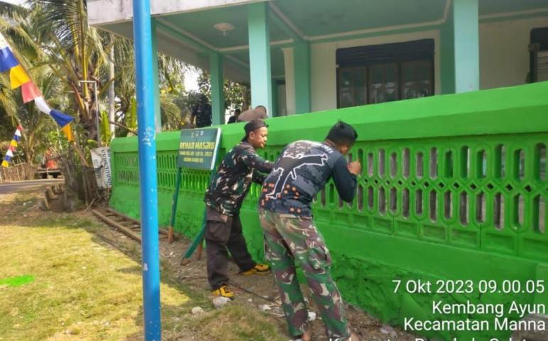 Bengkulu Selatan – Sinergitas TNI-Polri hingga masyarakat terlihat dalam kegiatan TNI Manunggal Membangun Desa (TMMD) Reguler ke-118 Kodim 0408 BSK Tahap I Tahun Anggaran 2023, personel Polres Bengkulu Selatan Polda Bengkulu aktif terjun lapangan bahu membahu ikut merehab Masjid dan Pos Kamling, di desa Kembang Ayun Kecamatan Manna Bengkulu Selatan, pada Sabtu( 07/10/23).