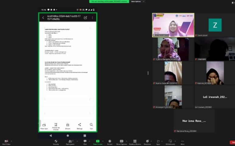 Mahasiswa diberi beberapa video terkait penjelasan metode penelitian kualitatif melalui yotube untuk ditonton oleh mahasiswa. Kemedian, setiap mahasiswa berkewajiban untuk menjelaskan hasil review dari materi yang ditonton di depan teman-teman mereka, beber Rochmatul Ummah. "Kami seluruh mahasiswa semester 6 Prodi Akuntansi mengucapkan selamat kepada Ibu Dr. Risma yang lolos sebagai Asesor Badan Akreditasi Nasional Perguruan Tinggi (BAN PT) 2023, semoga kami semua selalu terinspirasi kepada Bu Risma" ucapan selamat yang diwakili Rohmatul kepada Dosennya yang baru lolos BAN PT.