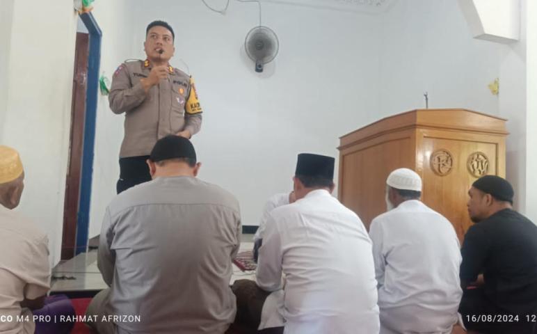 Kaur - Kapolres Kaur AKBP Yuriko Fernanda, S.H.,S.I.K.,M.H., didampingi Kasat Intel, Kasat Lantas, dan Kapolsek Kaur Selatan melaksanakan safari shalat Jum’at dengan mengunjungi Masjid Al Manar Desa Air Dingin Kecamatan Kaur Selatan Jumat (16/08/2024).