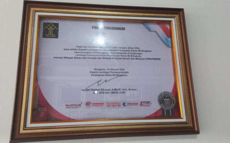Untuk itu dalam rangka pencapaian target kinerja tahun 2024 dan upaya mewujudkan satuan kerja di lingkungan Kantor Wilayah Kemenkumham Bengkulu berpredikat WBK dan WBBM telah dilaksanakan Deklarasi Janji Kinerja dan Pencanangan Pembangunan Zona Integritas Tahun 2024 di lingkungan Lapas Perempuan Kelas IIB Bengkulu Tema yang diangkat dalam deklarasi janji kinerja dan pencanangan zona integritas menuju WBK/WBBM tahun 2024 yaitu BerAKHLAK (Berorientasi Pelayanan Akuntabel Kompeten