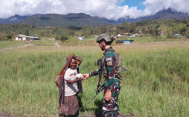 Puncak Papua - Prajurit Satgas Pamtas RI-PNG Mobile Yonif 323/BP Kostrad Pos Sinak Bandara Melaksanakan Kegiatan Minggu Kasih dengan membagikan Nasi Bungkus Kepada Masyarakat yang lewat Depan Pos, Distrik Sinak, Kab.Puncak, Papua, Minggu (30/06/2024)