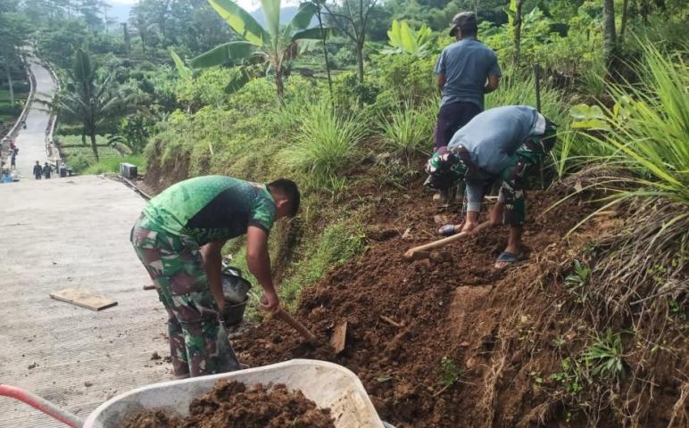 Terlihat di lapangan, Prada Wakhid, anggota Satgas TMMD Reguler ke-126, bersama warga Bapak Tarjo (38) bahu-membahu menggali dan meratakan tanah di sisi jalan yang baru saja selesai dicor. Aktivitas ini dilakukan agar struktur bahu jalan menjadi lebih kuat dan rapi, sekaligus mencegah erosi saat musim hujan tiba.