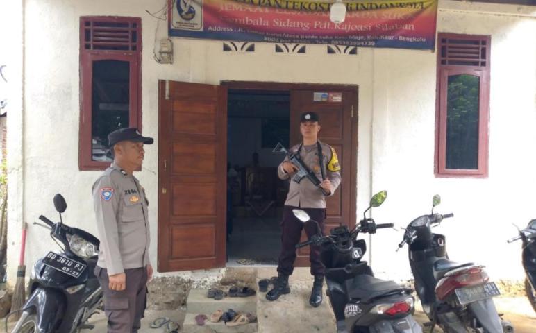 Kaur  - Personel Polsek Maje Polres Kaur Polda Bengkulu, Aiptu YA.Zega, berserta Aipda Siswanto dan Brigpol N. Pansuri melaksanakan Pengamanan Gereja di Desa Parda Suka Bakal Kecamatan Maje Kabupaten Kaur Minggu, (04/08/2024), Pukul 11.00 Wib.