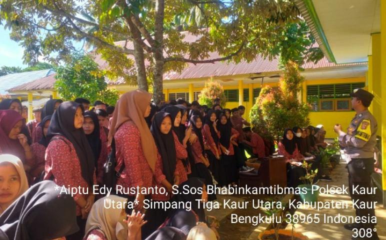 Kaur - Bhabinkamtibmas Polsek Kaur Utara Polres Kaur Polda Bengkulu, Aiptu Edy Rustanto, Aipda Anton Susilo pada hari Senin, (05/05/2023), melaksanakan giat Police Go to School di SMAN 04 Kaur Kecamatan Kaur Utara Kabupaten Kaur Sekira pukul 09.00 WIB s/d Selesai.