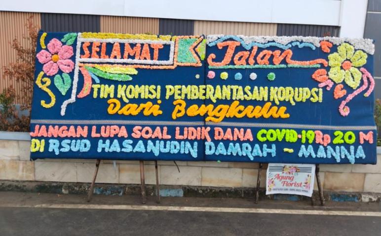 Papan bunga berisi,"Tolong Lidik Dana Covid-19 Rp 20 M di RSUD Hasanuddin Damrah Manna" terpajang saat Tim KPK menginjakan kaki di Bandara Fatmawati Sukarno.