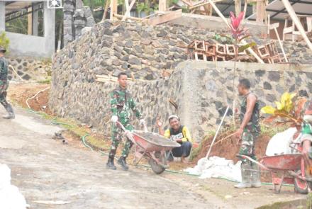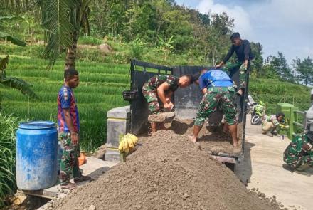 Bahu Membahu TNI Bersama Warga Mengangkat Material Pembangunan Jalan