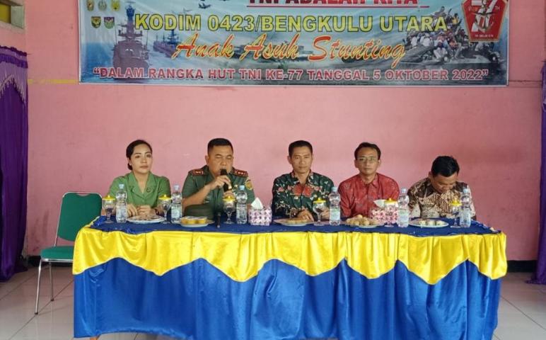 Kegiatan ini merupakan rangkaian memperingati HUT TNI ke-77 TA. 2022, Kodim 0423/BU, juga memberikan bantuan kepada Anak stunting. pelaksanaan kegiatan tersebut disambut baik masyarakat untuk menurunkan angka stunting di wilayah Kabupaten BU, sehingga Kabupaten Bengkulu Utara bebas Stunting dan memberi motivasi agar melakukan pola hidup sehat.