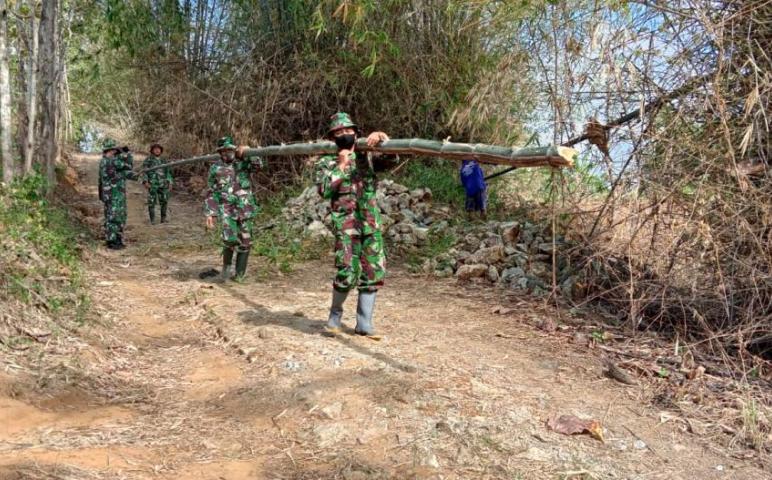Satgas bersama dengan warga setempat bersama-sama menyiapkan sarana dan prasarana penunjang, kali ini terlihat mereka sedang menyiapkan kayu dan bambu untuk nenompang cor jembatan yang akan dikerjakan. Rabu(15/09/2021).
