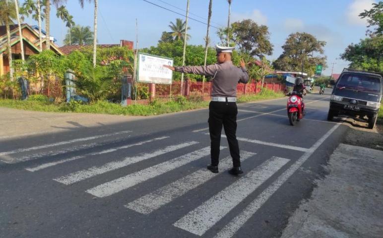 Personil Polsek Ketahun membantu menyebrangkan jalan bagi anak anak yang sedang berangkat ke sekolah dan memberikan himbauan kepada Masyarakat agar selalu berhati hati dan mematuhi peraturan lalu lintas dalam berkendara, sehingga tidak terjadi kemacetan maupun kecelakaan lalu lintas.