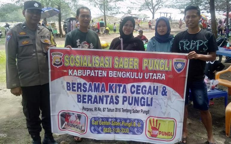 Bengkulu Utara - BhabinKamtibmas Polsek Ketahun Aipda Ramadhona melakukan sosialisasi Saber Pungli di objek wisata Pantai Terapik Ketahun pada siang Senin (01/01/2024).