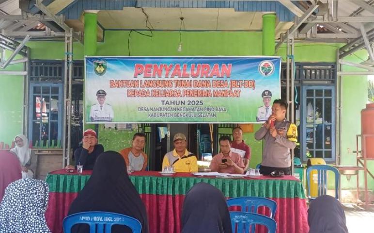 Pino Raya, 11 April 2025 – Bhabinkamtibmas Polsek Pino Raya, Brigpol Otnel Valentinus, menghadiri kegiatan penyaluran Bantuan Langsung Tunai Dana Desa (BLT DD) Tahun Anggaran 2025 yang dilaksanakan di Desa Nanjungan, Kecamatan Pino Raya, Kabupaten Bengkulu Selatan. Kegiatan ini dimulai pada pukul 09.30 WIB dan berlangsung tertib serta lancar.