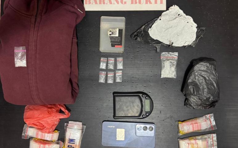 Barang bukti yang diamankan di lokasi pertama di antaranya enam paket kecil narkotika jenis sabu yang ditemukan di kamar terduga pelaku, satu paket besar sabu yang terselip di dinding dapur, satu unit timbangan digital, empat bungkus plastik klip bening ukuran kecil, satu bungkus plastik klip bening ukuran besar, satu unit telepon genggam merek Realme berwarna biru, serta satu buah jaket berwarna merah.