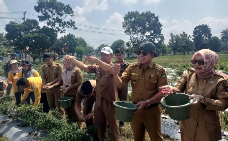 Bengkulu Selatan - Sekretaris Daerah Sukarni, S.P., M.Si bersama dengan Dinas Pertanian memanen hasil tanaman cabai merah di halaman Kantor Bupati Bengkulu Selatan, Senin (6/5/24).