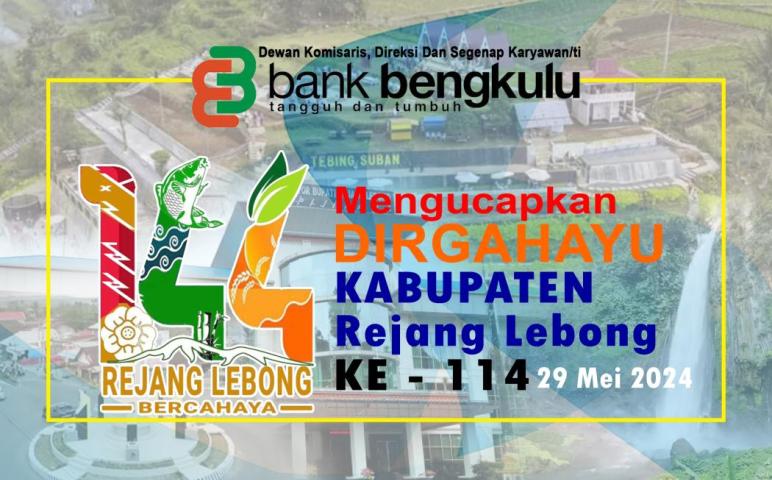 Bengkulu, Wartaprima.com - Dewan Kamisaris, Direksi dan Segenap Karyawan/I Bank Bengkulu mengucapkan Hari Ulang Tahun (HUT) Kabupaten Rejang Lebong (Curup) ke 144 Tahun, yang peringatannya pada tanggal 29 Mei 2024.