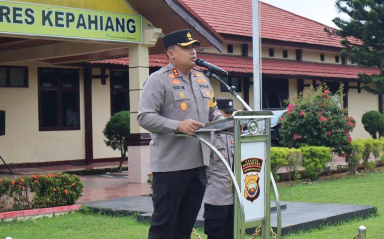 Kepahiang – Kepala Kepolisian Resor (Kapolres) Kepahiang AKBP Eko Munarianto S.I.K memimpin apel pagi jam pimpinan di lapangan apel Mapolres Kepahiang, Senin (25/03/2024) pagi.