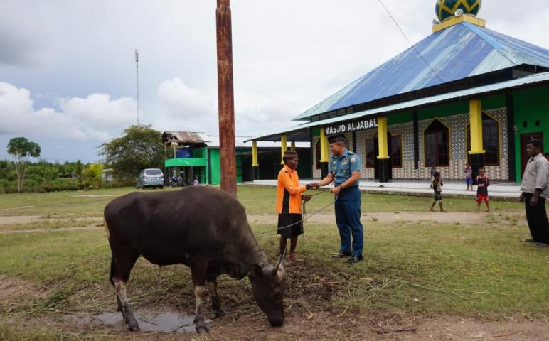 Kepala Dinas Pembinaan Potensi Maritim (Kadispotmar) Koarmada III, Kolonel Laut (P) Slamet Aryadi, S.E., M.Tr.Opsla, turut menyerahkan hewan kurban di Kampung Maibo, Aimas, Papua Barat Daya.