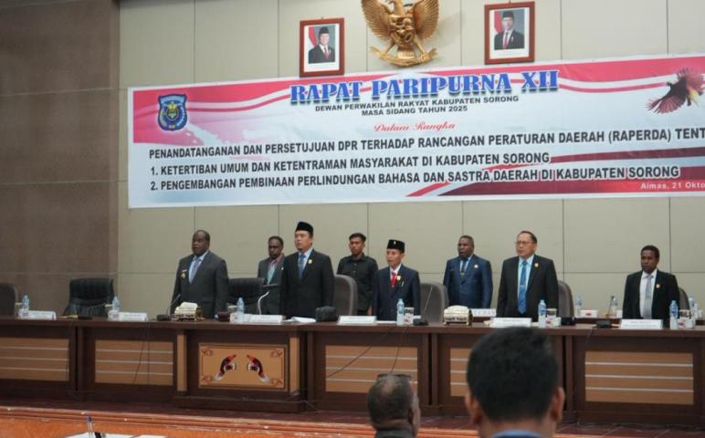 Sorong — Dewan Perwakilan Rakyat Daerah (DPRD) Kabupaten Sorong menggelar Rapat Paripurna XII Masa Sidang Tahun 2025 dalam rangka pengesahan dua Rancangan Peraturan Daerah (Raperda) strategis bertempat di Ruang Sidang DPRD Kabupaten Sorong.