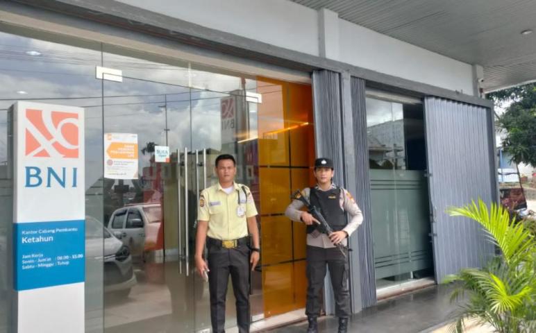 Bengkulu Utara - Anggota Polsek Ketahun melaksanakan pengamanan obyek vital di kantor Bank BNI KCP Ketahun, Selasa (02/01/2024).