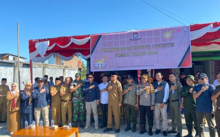 Kaur - Kapolres AKBP Eko Budiman, diwakili Wakapolres Kaur Kompol. Enggarsah Alimbaldi, S.H., S.I.K., bersama Unsur Forkopimda menghadiri pelaksanaan pelepasan pendistribusian logistik dan kelengkapan TPS sulit untuk Pemilu 2024 di Kabupaten Kaur, Senin (12/02/2024) di Gudang Logisik III KPUD Kaur.