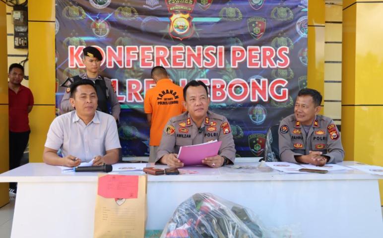 Kapolres Lebong AKBP Awilzan didampingi Kasat Reskrim Iptu Alexander dan Kasi Humas Iptu Fahrul Afandi saat press release di Mapolres Lebong, Rabu (17/5/2023) mengatakan, tersangka melakukan aksinya pada Selasa (16/5/2023) pagi dengan korban SA, di Kelurahan Tanjung Agung Kecamatan Pelabai Kabupaten Lebong.