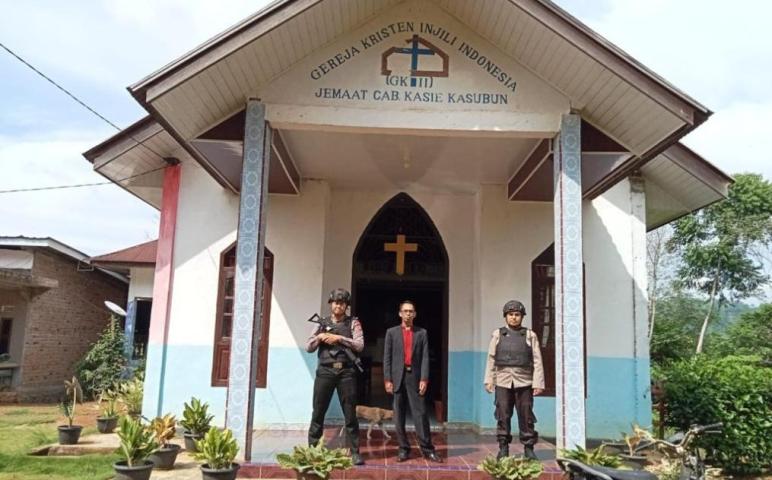 Rejang Lebong - Polsek Padang Ulak Tanding (PUT) Polres Rejang Lebong Polda Bengkulu melaksanakan kegiatan pengamanan ibadah Gereja GKII di desa Kasie kasubun kecamatan Padang Ulak Tanding Kabupaten Rejang Lebong, Minggu (18/06/2023).