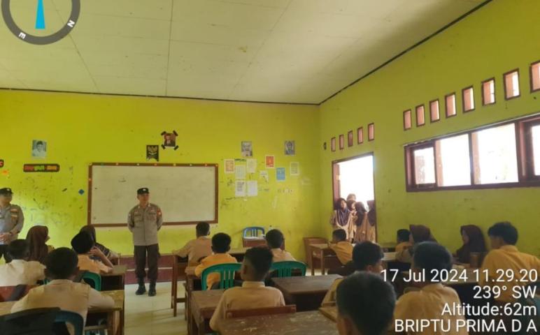 Kaur - Personil Sat Binmas Polres Kaur Polda Bengkulu, Bripka Pitrusdi, Briptu Prima D.A melaksanakan kegiatan penyuluhan dan Sosialisasi di SMPN 1 Kaur Kabupaten Kaur. Rabu (17/07/2024) pukul 11.00 Wib.