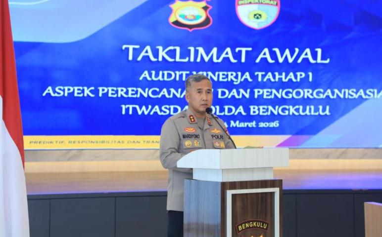 Bengkulu – Kapolda Bengkulu Irjen Pol. Mardiyono, S.I.K., M.Si. secara resmi membuka kegiatan Taklimat Awal Audit Kinerja Tahap I Tahun Anggaran 2026 aspek Perencanaan dan Pengorganisasian pada Satker dan Polres/Ta jajaran Polda Bengkulu, Rabu (04/03/2026) pukul 09.30 WIB, bertempat di Aula Rupatama Awaloedin Djamin Polda Bengkulu.