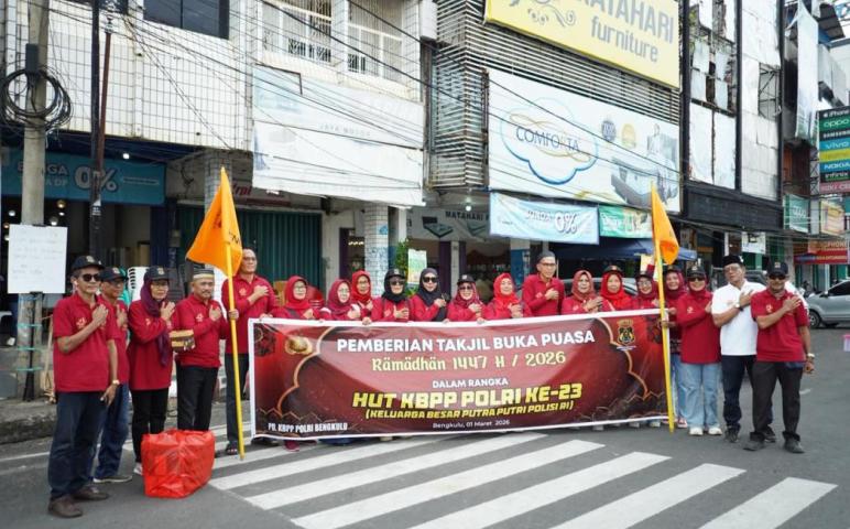 Bengkulu - Keluarga Besar Putra-Putri Polri (KBPP) Polri Bengkulu melaksanakan kegiatan bagi takjil  di depan Mapolda Bengkulu selanjutnya di laksanakan di Jalan Suprapto simpang lima bundaran fatmawati dan dilanjutkan buka bersama dalam rangka HUT ke 23 di Resto Raso Raso Pantai Panjang Kota Bengkulu, Minggu (1/3/2026).