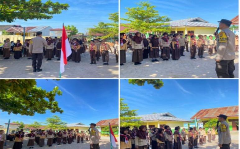 Bhabinkamtibmas Polsek Muara Bangkahulu melakukan pembinaan karakater Kurikulum Pramuka Wajib di SDN 103 Kota Bengkulu, Sabtu (20/05/2023).