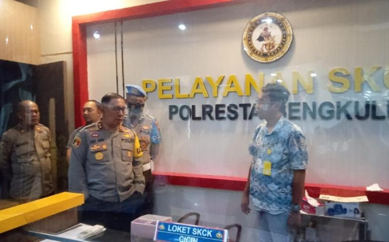 Berlangsung di area Satpas (Satuan Penyelenggara Administrasi SIM) dan Pembuatan SKCK (Surat Keterangan Catatan Kepolisian), kegiatan pengecekan dilakukan dengan melihat secara langsung proses pelayanan serta kelengkapan ruang pelayanan publik yang dimiliki Polresta Bengkulu, terang Kasie Humas AKP Sugiarto dalam keterangan tertulisnya.
