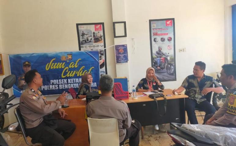 Bengkulu Utara - Jumat Curhat kembali dilaksanakan oleh anggota Polsek Ketahun Polres Bengkulu Utara Polda Bengkulu, Jumat (26/01/2024) pagi. Dalam kegiatan Jumat Curhat ini, dipimpin oleh Kanit Binmas Aiptu Juni Amir Purba dan digelar di Dealer Honda Ketahun.