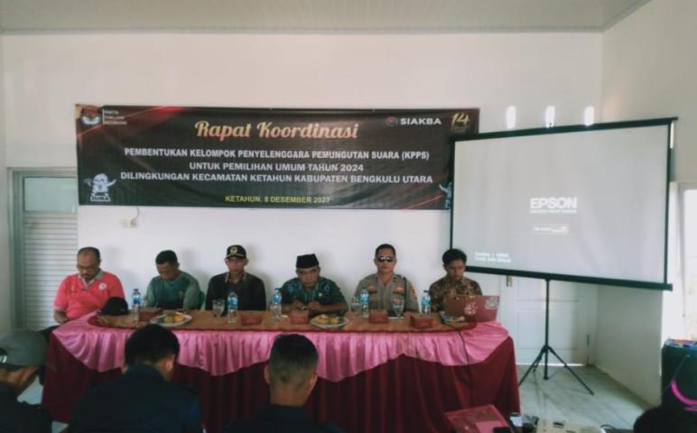 Rapat koordinasi dihadiri Ketua PPK Ketahun Hendri Nizwan, Anggota PPK Ketahun Hendika Pamulih, Anggota PPK Ketahun Risdianto, Anggota PPK Ketahun Lina, Anggotq PPK Ketahun Edison, Ketua Panwascam Ketahun Zulfan Haryadi, Camat Ketahun Nasri S.Pd, Kapolsek Ketahun Diwakilkan Waka Polsek Ketahun IPDA Abriadi, Danramil Ketahun Kapten Yudi Triawan, dan Seluruh PPS seKecamatan Ketahun dari Desa Urai, Desa Giri Kencana,Desa Bukit Tinggi,Desa Bukit Indah,Desa Pasar Ketahun, Desa Kualalangi,Desa Talang Baru,Desa Dusun Raja, Desa Melati Harjo,Desa Fajar Baru,Desa Lubuk Mindai.