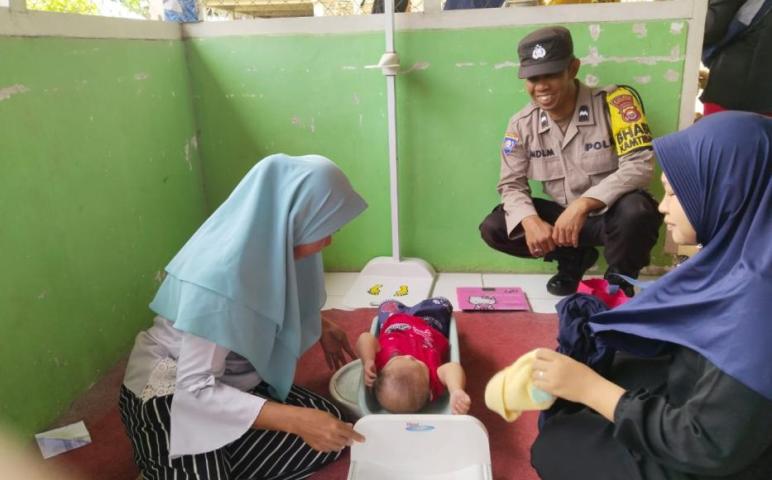 Pada kesempatan itu Bhabinkamtibmas juga turut membantu melakukan timbang badan Balita, memegangi Balita saat akan diimunisasi, serta memberikan vitamin A kepada balita. Hal ini dilakukan sebagai upaya lebih mendekatkan diri dengan masyarakat.